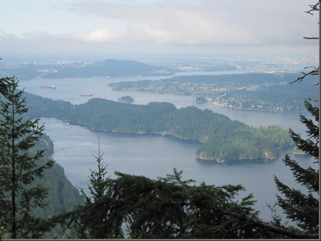 Soon we reach by far the best lookout of the walk – the view opens up right across Indian Arm and into the city. The long finger of land sticking into the bay is Belcarra Regional Park, with Deep Cove beyond on the opposite bank and Seymour shrouded in cloud to the right.